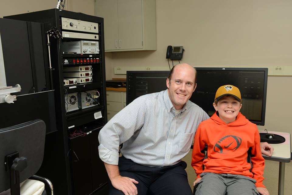 Dr. Joseph Carroll and Raymond An image of Raymond’s cones (large bumps) within his retina as seen by Dr. Carroll’s split-detector adaptive optics.